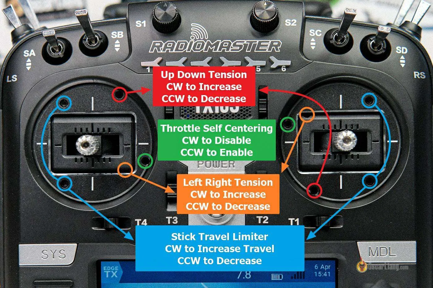 Pour ajuster la dureté des 4 axes des gimbals, il est inutile d'ouvrir la radio : tout se passe en façade, à l'aide d'un petit tournevis hex. Voir le schéma ci-dessous (crédit : Oscar Liang pour la photo annotée)